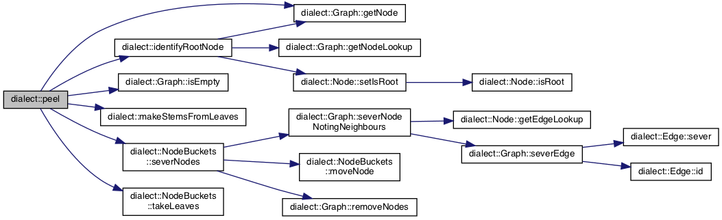 References dialect::Graph::getNode(), identifyRootNode(), dialect::Graph::isEmpty(), makeStemsFromLeaves(), dialect::NodeBuckets::severNodes(), and dialect::NodeBuckets::takeLeaves().
